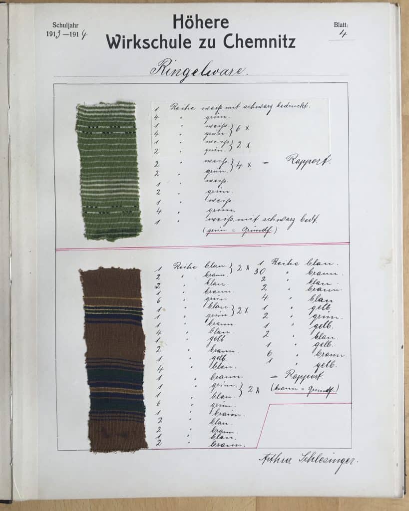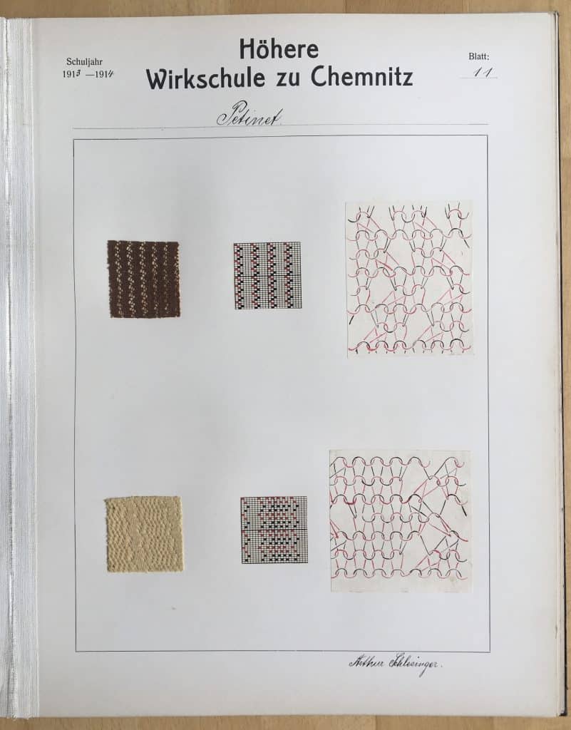 Dokumentiert wird hier ein Musterbuch aus der Höheren Wirkschule zu Chemnitz, Schuljahr 1913/1914, von Arthur Schlesinger. Es hat nicht direkt mit dem Thema der Website, der Putzmacherei und den Putzmacherinnen, zu tun, wohl aber mit der Sorgfalt, mit der Bildung im textilen Kontext betrieben wurde.