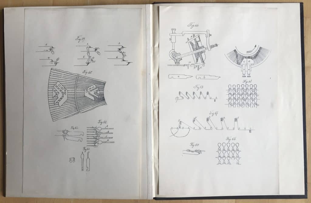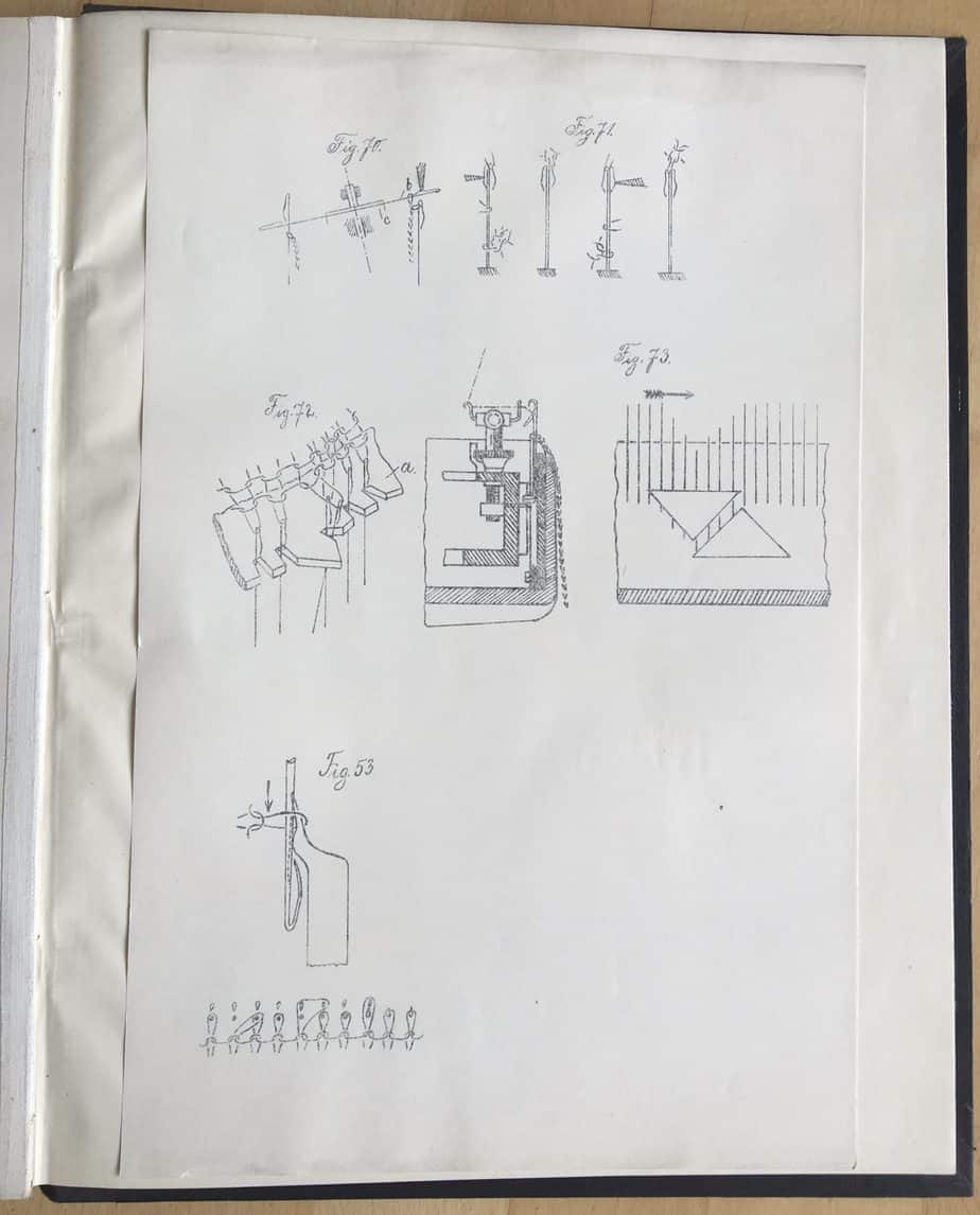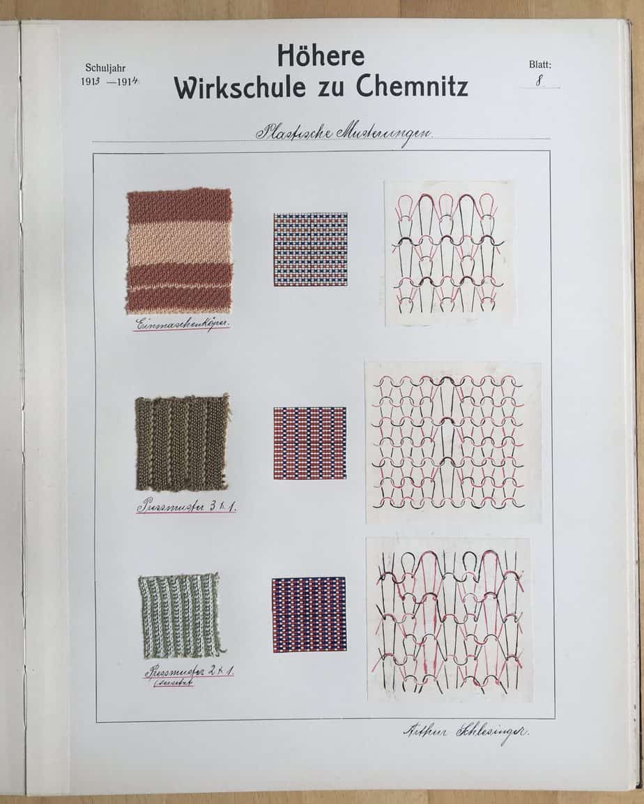 Zu den Fachschulen für Textilindustrie habe ich bereits ausführlich geschrieben. Im vorliegenden Beispiel wurde offensichtlich mit vorgedruckten Bögen der Wirkschule gearbeitet. Das Buch umfasst 19 Bögen; ob sie bereits so gebunden waren oder erst im Nachhinein, ist leider nicht festzustellen. Die Wirkmuster wurden eingeklebt und das Ergebnis der Zerlegung dazu notiert, ebenso die Fadenlegung bzw. die Patrone. Fünf lose Blätter als Kopien fanden sich hinten im Buch, mit Abbildungen der Maschinen und Schlingenführung usw.