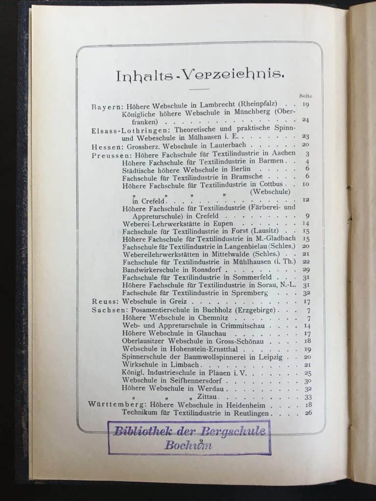 Ein „Textil-Cursus-Buch“ aus der Mitte des 19. JH findet sich seit kurzem in meiner Sammlung. Daher beschäftigte mich die Frage, ab wann es überhaupt Textil-Fachschulen, Webschulen usw. in Deutschland gegeben hat. Wo fanden solche Kurse statt? Als zeitgenössische Quelle habe ich die folgende Veröffentlichung über das Deutsche Fachschulwesen gefunden: