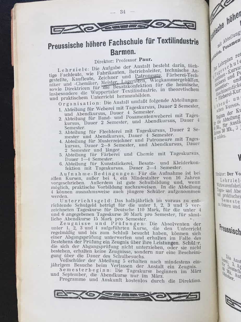 „Die Schule bezweckt die Vorbildung von Fabrikanten, Fabrikdirektoren, Ein- und Verkäufern, Musterzeichnern, Kaufleuten, Fabrikbeamten, wie Meister, Direktricen, Lageristen, Wiegkammergehülfen und ähnliche Angestellte. Bei dem Unterrichte wird vorwiegend die Wuppertaler Textilindustrie berücksichtigt…“ - Berlin (1904): Städtische Höhere Webschule mit Abteilungen für Weberei, Musterzeichnen, Konfektion, Posamentiererei, Stickerei, Wirkerei und Färberei